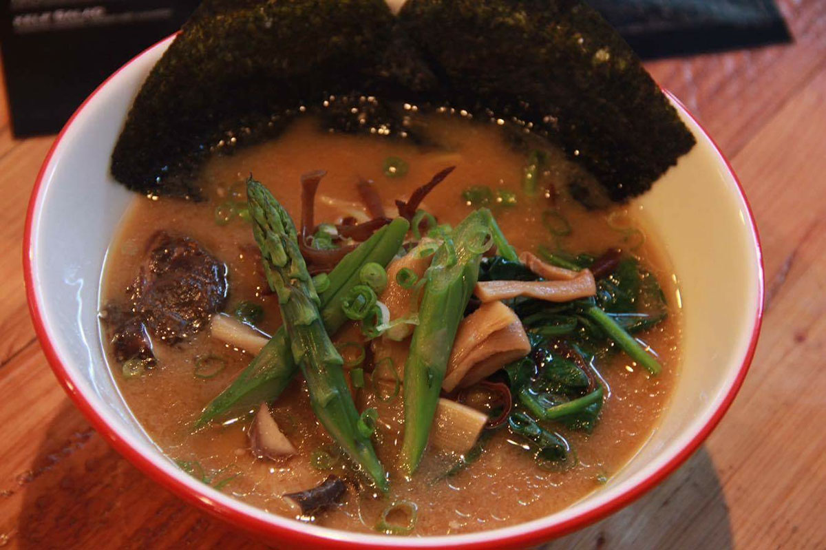 Homemade miso paste, shitake mushroom, spinach, menma, nori, scallion, asparagus (wavy noodles)