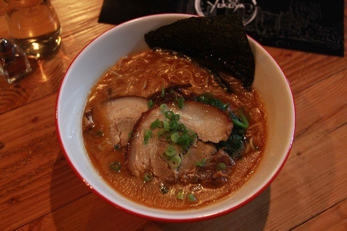 Enjoy a hot bowl of ramen in front of our glorious wall of Yokohama!